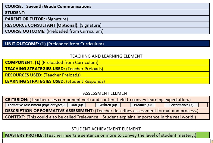 The teaching/learning contract can be saved, completed, and used electronically by each student for every subject. General information is located on a cover page shown below in light blue. Subsequent sections include the unit, the teaching and learning element that focuses on the component, the component’s assessment element, and the component’s achievement element.
